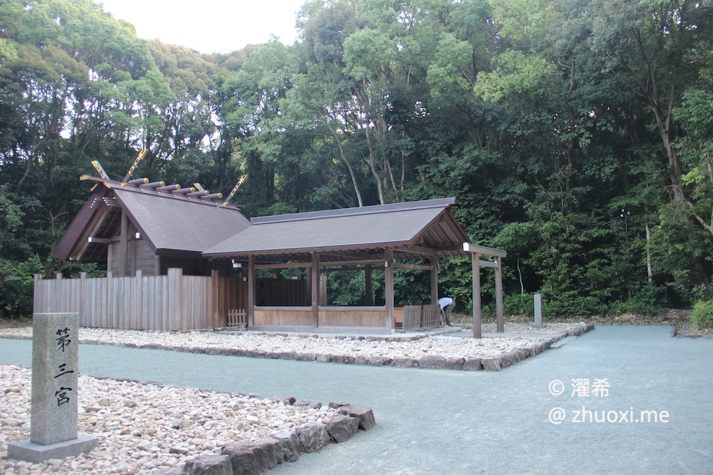 接下来是小路看不见尽头的,只有两边从上云霄的树和头上一百万个蝉的叫声,仿佛这个世界上只剩这条路和蝉了。这聒噪,震天响,不停歇的蝉声,居然让我感觉这里十分寂静。走在这条路上,真个身心都被洗涤干净了。走了大概5分钟后,看到了一个鸟居。鸟居后面是供奉着其他两位宗像女神的第二宫和第三宫。
