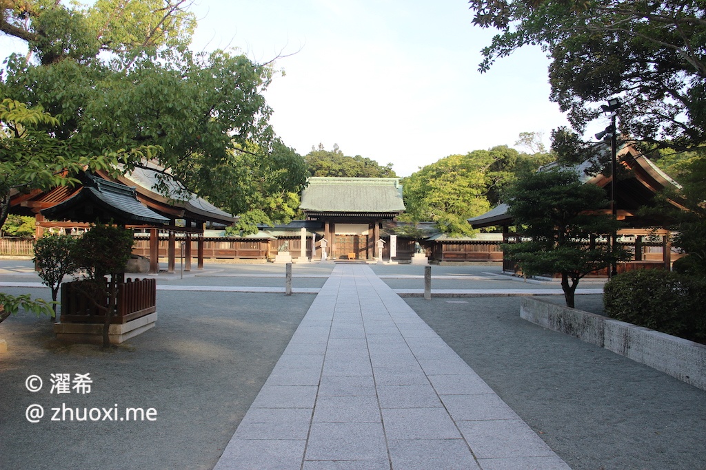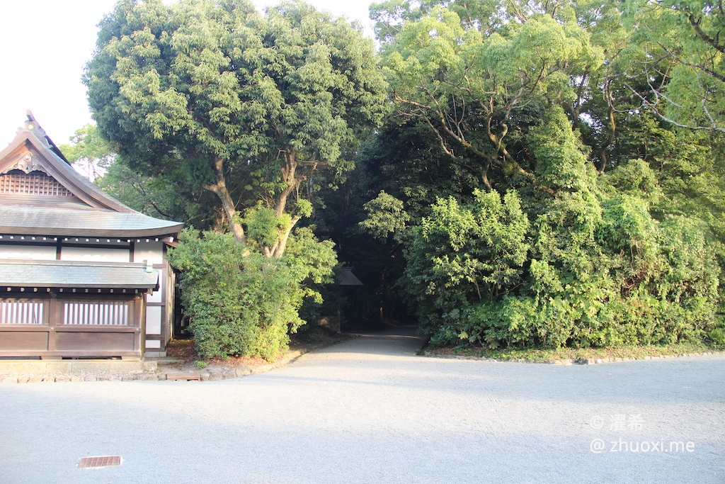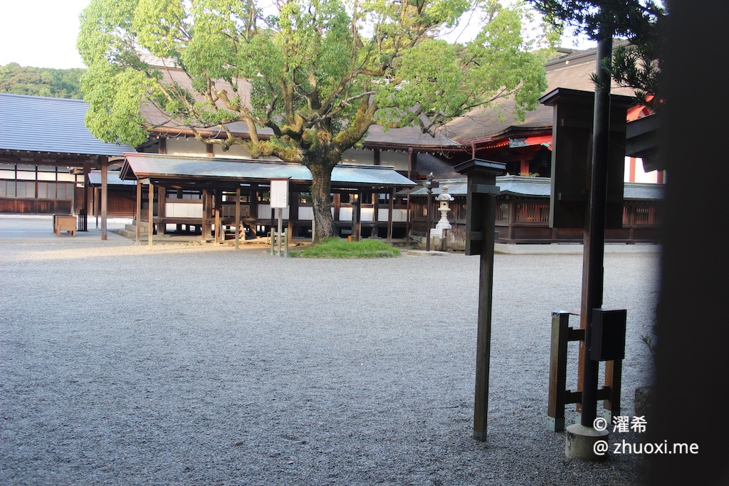 走过太鼓桥,眼前出现了宗像大社的本殿。本殿已经关门,社中已无人影,任我走来走去,只有空中的蝉鸣和脚下沙沙的脚步声。此时此刻,远离喧嚣,在这古朴侘寂之美中,心得到安宁。 我徘徊在院中,久久不愿离去。